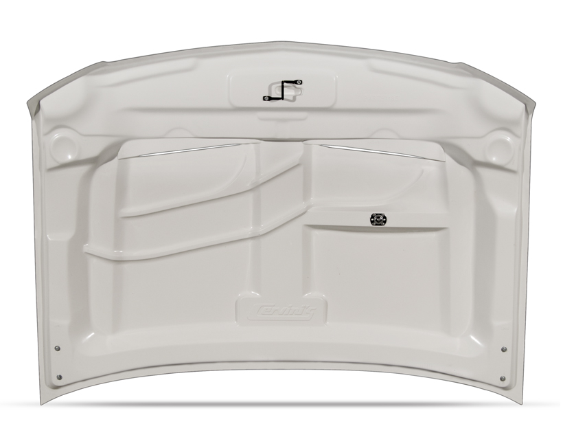 Finished underside liner adds extra strength and can be painted for a show quality appearance. Pre-cut front air ducts. Highest point of Hood rise: 1-1/4". Width of scoop opening: 14". Height of scoop opening: 1-7/8”.